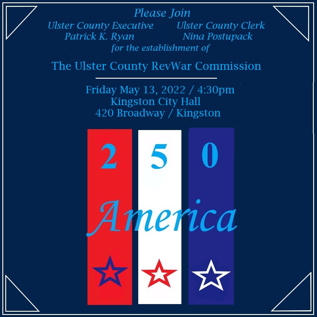 Kingston, NY – Ulster County Clerk Nina Postupack and Ulster County Executive Pat Ryan invite you to join them for the signing of the Executive Order creating the “Ulster County RevWar 250th Commission” in commemoration of the 250th anniversary of the Revolutionary War. The signing will take place on Friday, May 13, 2022, at 4:30 pm at Kingston City Hall, 420 Broadway, in the Common Council Chambers.